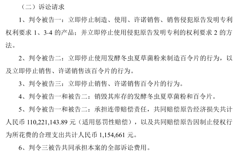 据佐力药业2024年1月的公告,华东医药方面的诉讼请求包括判令珠峰原料停止制造、销售侵权产品、停止使用侵权方法,判令珠峰药业停止由此制造、销售百令片。